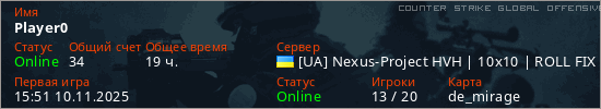 Играет на Counter Strike Global Offensive сервере. Страна: УкраинаПервый раз замечен 15:51 10.11.2025