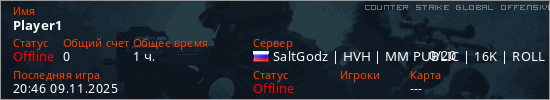Играет на Counter Strike Global Offensive сервере. Страна: РоссияПервый раз замечен 22:26 19.10.2025
