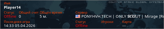 Играет на Counter Strike Global Offensive сервере. Страна: СШАПервый раз замечен 14:31 05.04.2026