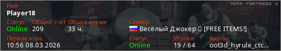 Играет на Team Fortress 2 сервере. Страна: РоссияПервый раз замечен 10:56 08.03.2026