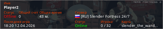 Играет на Team Fortress 2 сервере. Страна: РоссияПервый раз замечен 16:25 29.03.2026