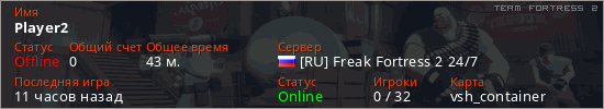Играет на Team Fortress 2 сервере. Страна: РоссияПервый раз замечен 20:50 08.03.2026