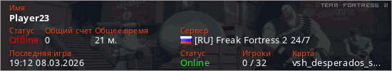 Играет на Team Fortress 2 сервере. Страна: РоссияПервый раз замечен 18:29 08.03.2026