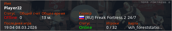 Играет на Team Fortress 2 сервере. Страна: РоссияПервый раз замечен 18:41 08.03.2026