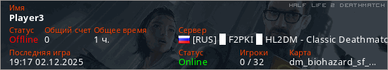 Играет на Half Life 2 DeathMatch сервере. Страна: РоссияПервый раз замечен 21:42 12.11.2025