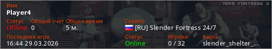 Играет на Team Fortress 2 сервере. Страна: РоссияПервый раз замечен 16:42 29.03.2026