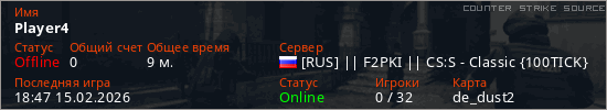 Играет на Counter Strike Source сервере. Страна: РоссияПервый раз замечен 14:09 12.02.2026