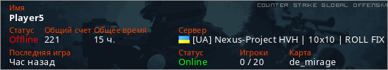 Играет на Counter Strike Global Offensive сервере. Страна: УкраинаПервый раз замечен 19:06 10.11.2025