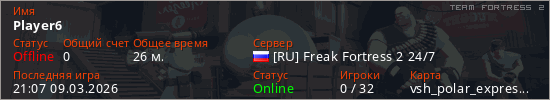 Играет на Team Fortress 2 сервере. Страна: РоссияПервый раз замечен 18:27 08.03.2026