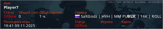 Играет на Counter Strike Global Offensive сервере. Страна: РоссияПервый раз замечен 21:01 15.10.2025
