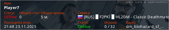 Играет на Half Life 2 DeathMatch сервере. Страна: РоссияПервый раз замечен 21:37 23.11.2025