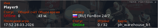 Играет на Team Fortress 2 сервере. Страна: РоссияПервый раз замечен 20:01 20.03.2026