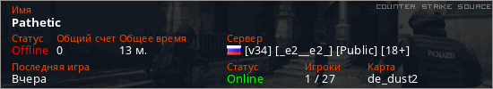 Играет на Counter Strike Source сервере. Страна: РоссияПервый раз замечен 14:33 18.11.2025