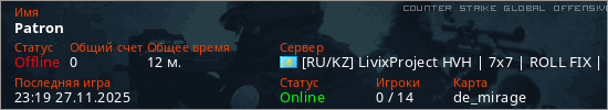 Играет на Counter Strike Global Offensive сервере. Страна: КазахстанПервый раз замечен 22:59 27.11.2025