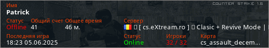 Играет на Counter Strike 1.6 сервере. Страна: РумынияПервый раз замечен 18:39 12.11.2024