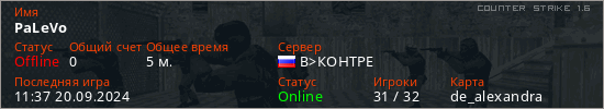 Играет на Counter Strike 1.6 сервере. Страна: РоссияПервый раз замечен 11:31 20.09.2024