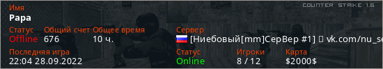 Играет на Counter Strike 1.6 сервере. Страна: РоссияПервый раз замечен 17:47 03.10.2021