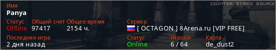 Играет на Counter Strike Source сервере. Страна: РоссияПервый раз замечен 04:03 07.06.2020