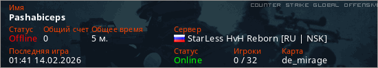 Играет на Counter Strike Global Offensive сервере. Страна: РоссияПервый раз замечен 01:18 14.02.2026
