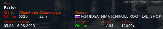 Играет на Counter Strike Source сервере. Страна: РоссияПервый раз замечен 10:12 03.02.2023