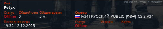 Играет на Counter Strike Source сервере. Страна: РоссияПервый раз замечен 19:30 12.12.2025