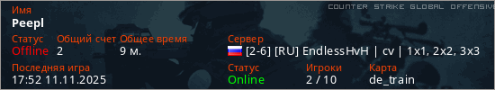 Играет на Counter Strike Global Offensive сервере. Страна: РоссияПервый раз замечен 17:21 11.11.2025