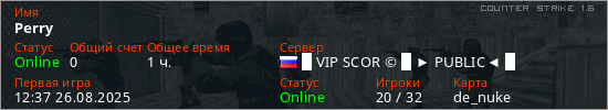 Играет на Counter Strike 1.6 сервере. Страна: РоссияПервый раз замечен 12:37 26.08.2025