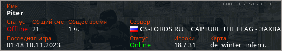Играет на Counter Strike 1.6 сервере. Страна: РоссияПервый раз замечен 17:55 15.11.2020