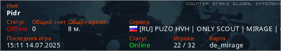 Играет на Counter Strike Global Offensive сервере. Страна: РоссияПервый раз замечен 14:31 14.07.2025