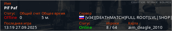 Играет на Counter Strike Source сервере. Страна: РоссияПервый раз замечен 13:09 27.09.2025