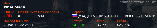 Играет на Counter Strike Source сервере. Страна: РоссияПервый раз замечен 23:53 14.02.2026