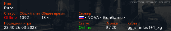 Играет на Counter Strike Source сервере. Страна: РоссияПервый раз замечен 23:20 18.02.2023