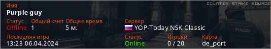 Играет на Counter Strike Source сервере. Страна: РоссияПервый раз замечен 13:05 06.04.2024