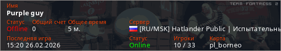Играет на Team Fortress 2 сервере. Страна: РоссияПервый раз замечен 15:18 26.02.2026