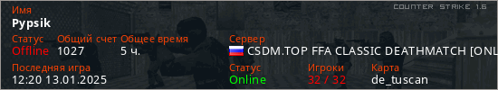 Играет на Counter Strike 1.6 сервере. Страна: РоссияПервый раз замечен 10:33 27.09.2021