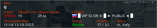 Играет на Counter Strike 1.6 сервере. Страна: РоссияПервый раз замечен 14:52 12.10.2025