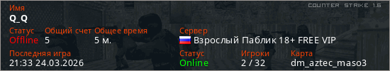 Играет на Counter Strike 1.6 сервере. Страна: РоссияПервый раз замечен 21:21 24.03.2026