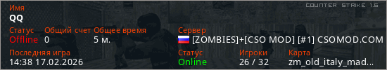 Играет на Counter Strike 1.6 сервере. Страна: РоссияПервый раз замечен 14:35 17.02.2026