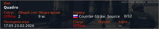 Играет на Counter Strike Source сервере. Страна: РоссияПервый раз замечен 16:30 23.02.2026