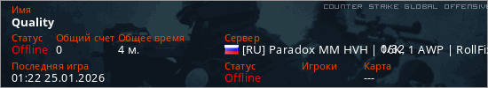 Играет на Counter Strike Global Offensive сервере. Страна: РоссияПервый раз замечен 00:52 25.01.2026