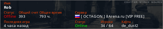 Играет на Counter Strike Source сервере. Страна: РоссияПервый раз замечен 04:36 12.09.2021