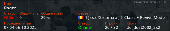Играет на Counter Strike 1.6 сервере. Страна: РумынияПервый раз замечен 09:17 14.12.2024