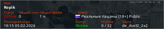 Играет на Counter Strike 1.6 сервере. Страна: РоссияПервый раз замечен 17:59 05.02.2026