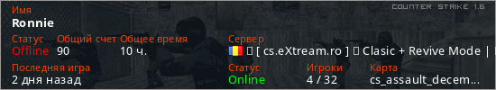 Играет на Counter Strike 1.6 сервере. Страна: РумынияПервый раз замечен 08:38 09.05.2025