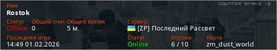 Играет на Counter Strike 1.6 сервере. Страна: УкраинаПервый раз замечен 14:34 01.02.2026