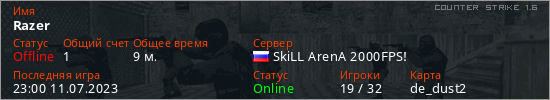 Играет на Counter Strike 1.6 сервере. Страна: РоссияПервый раз замечен 19:47 08.06.2023