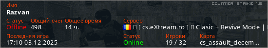 Играет на Counter Strike 1.6 сервере. Страна: РумынияПервый раз замечен 08:10 11.01.2025