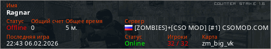 Играет на Counter Strike 1.6 сервере. Страна: РоссияПервый раз замечен 22:41 06.02.2026