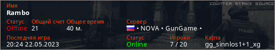Играет на Counter Strike Source сервере. Страна: РоссияПервый раз замечен 21:44 29.11.2022
