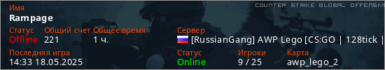 Играет на Counter Strike Global Offensive сервере. Страна: РоссияПервый раз замечен 20:14 15.03.2025